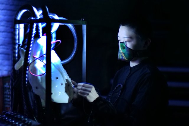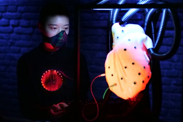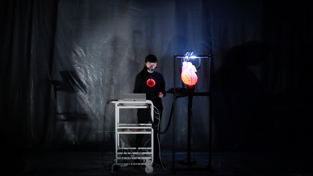 The installation is built according to the performer’s real heart from MRI scans and is enlarged from its actual size. It is designed to interact when the performer plugs in audio cables and bridge connections as the method of coronary artery bypass surgery. During the performance, the storyline is led by the sound and the mixed video of medical images and live performance from the webcam. The video and the sound also present the machine, which gives instruction to the performer as a physician. The patient (the heart) who (which) is operated on symbolizes human consciousness and faith. The performance brings out the question relating to the issue of the machine and humans: “If machines can reason even better than humans, will we as humans lose some abilities and even not believe in ourselves anymore?”