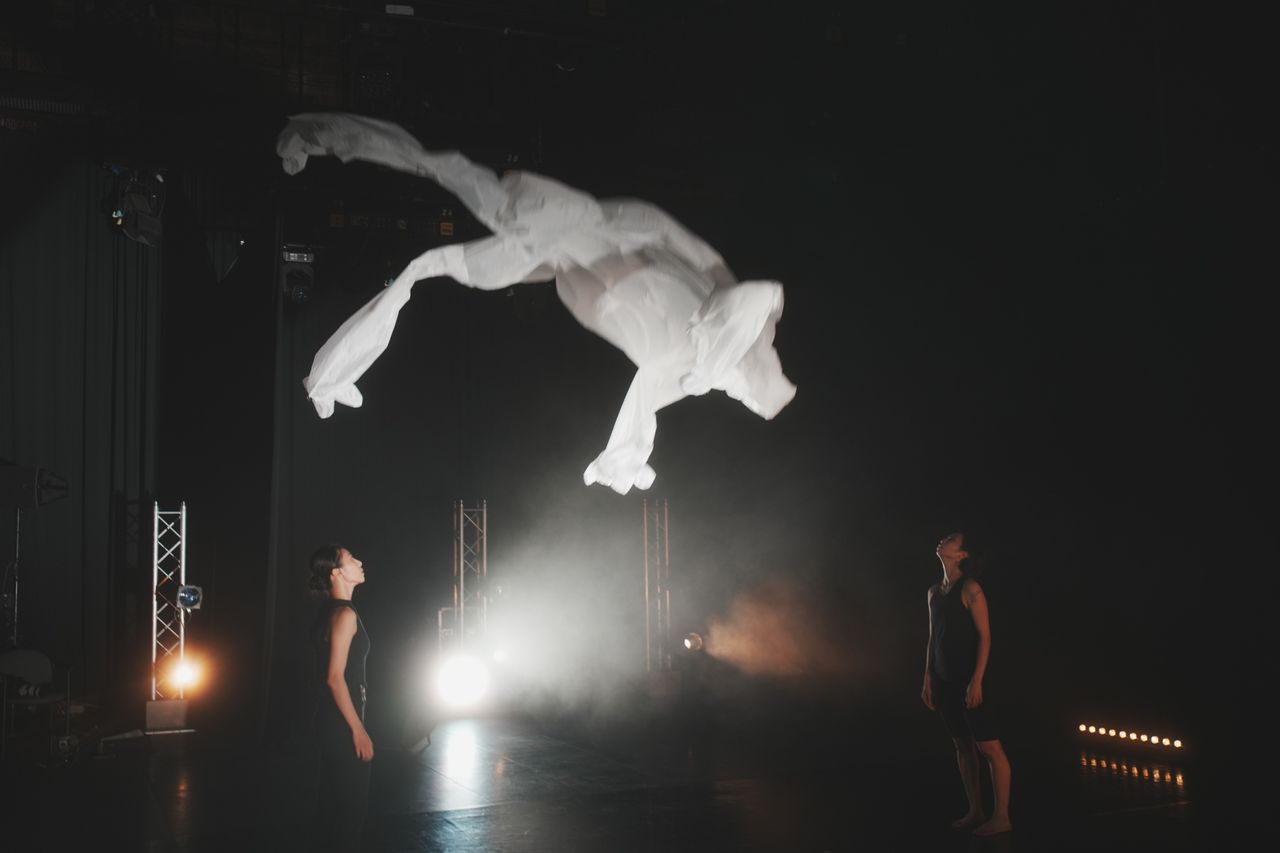 透過攝影機的深度感測技術結合影像mapping,舞者的身體與投影視覺交融於一起,創造出虛實交錯的沉浸式體驗。繩帶、布幕、自製人形氣球等道具的象徵性運用,配合精密的燈光與聲音設計,營造出從抗拒、行動、真實到擁抱的情感轉變過程。《探險者的信仰》作品期望能夠觸動不同文化背景的觀眾,共同思考性別平等的議題,讓歷史的回望成為現代前行的力量。